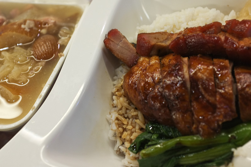 Got a half chicken with preserved veggie dinner set at just HK$48 (with a bowl of steamed rice and a drink), and the BBQ pork/roast goose on rice with a soup of the day at HK$36.  Food is not bad and I like the soup that they put quite much ingredients like yellow squash, snow fungus and dried date.  What's more, we can have a nice view to the bustling Causeway Bay.